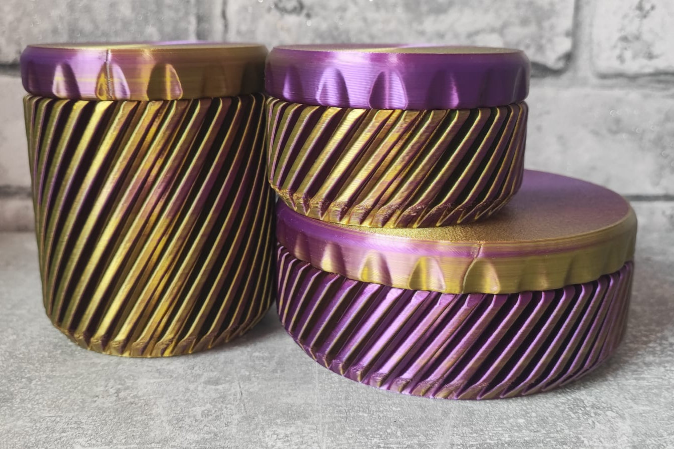Art 0296 Deko Schraub Dosen 3er -Set | 3D-gedruckt |klein, mittel, groß flach Dose | PLA lila gold schimmernd Deko Home Geschenk
