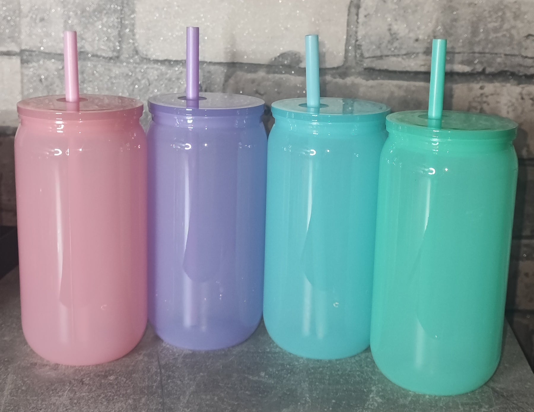 Farbiger Kunststoff Becher mit Strohhalm und UV Dtf Aufkleber - farbiger Deckel