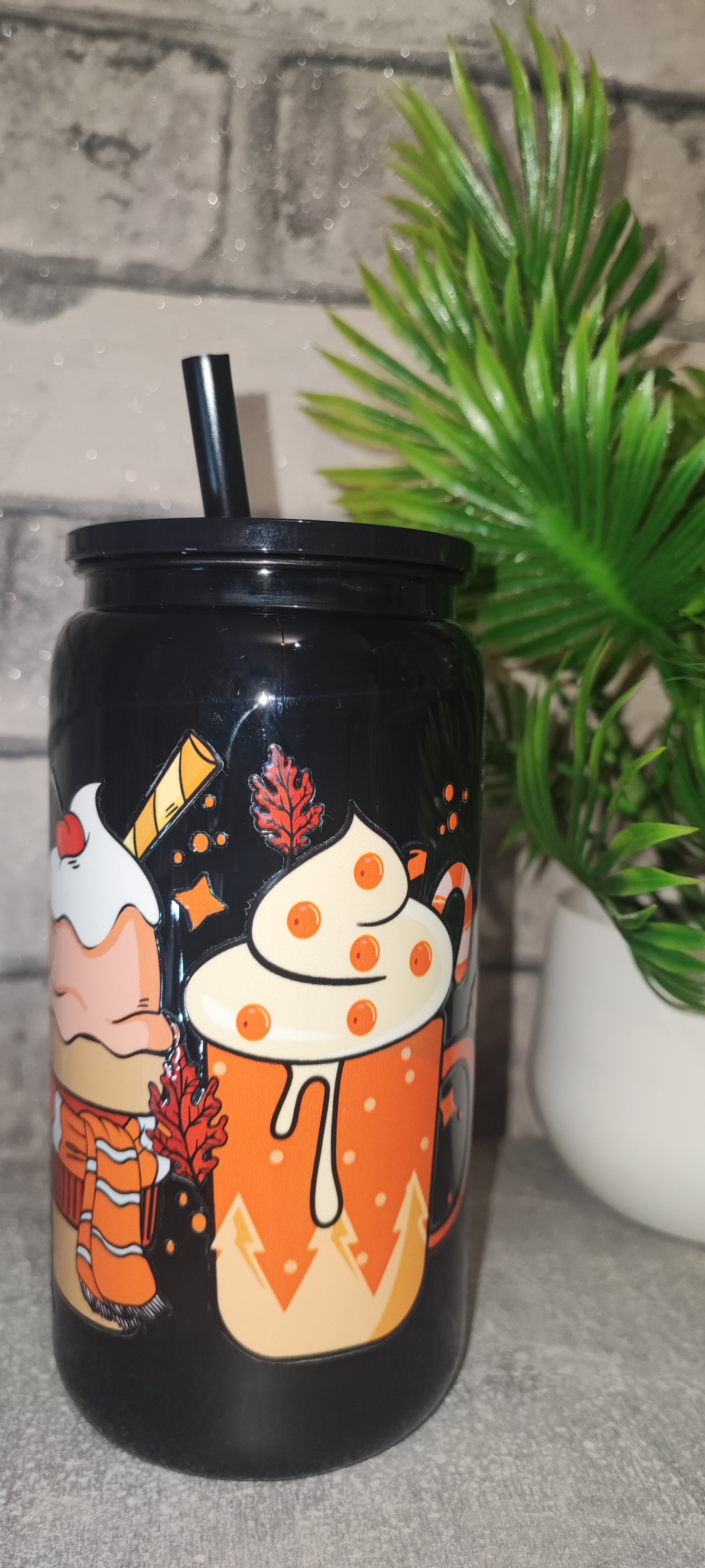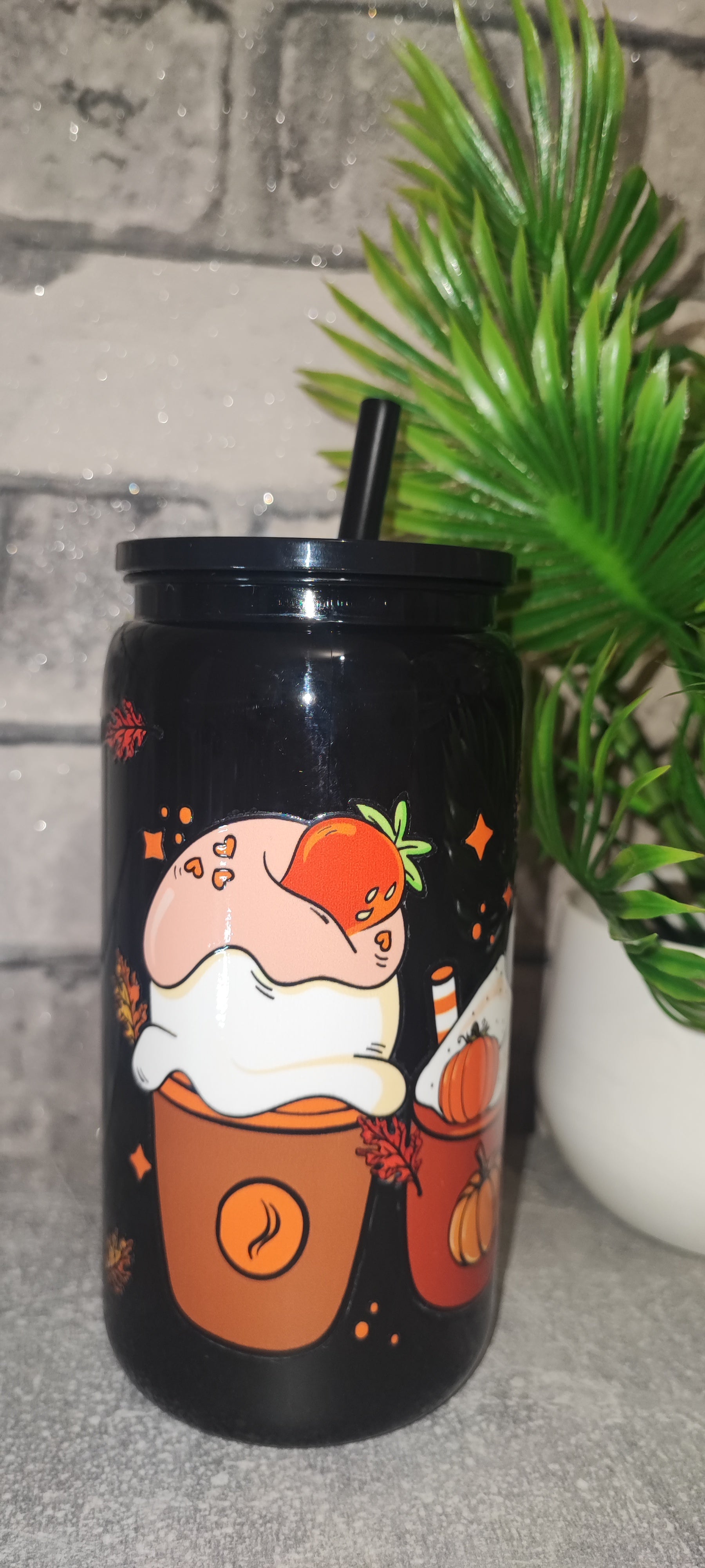 Schwarzer Becher mit schwarzen Deckel + UV Dtf Aufkleber inkl Strohhalm - Kunststoff - Herbst