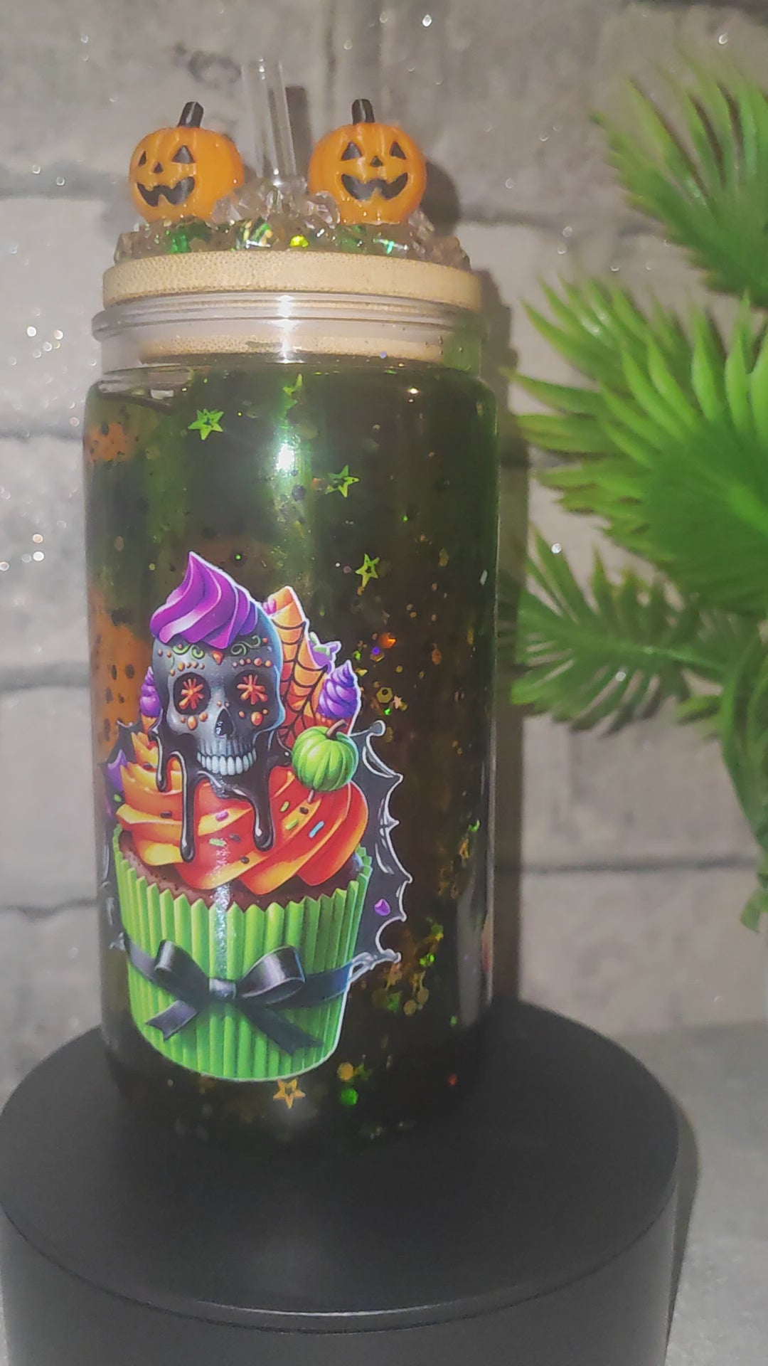 Grün/Orange Lava Becher mit Deko Deckel 3D Druck inkl Strohhalm - Kunststoff - Halloween