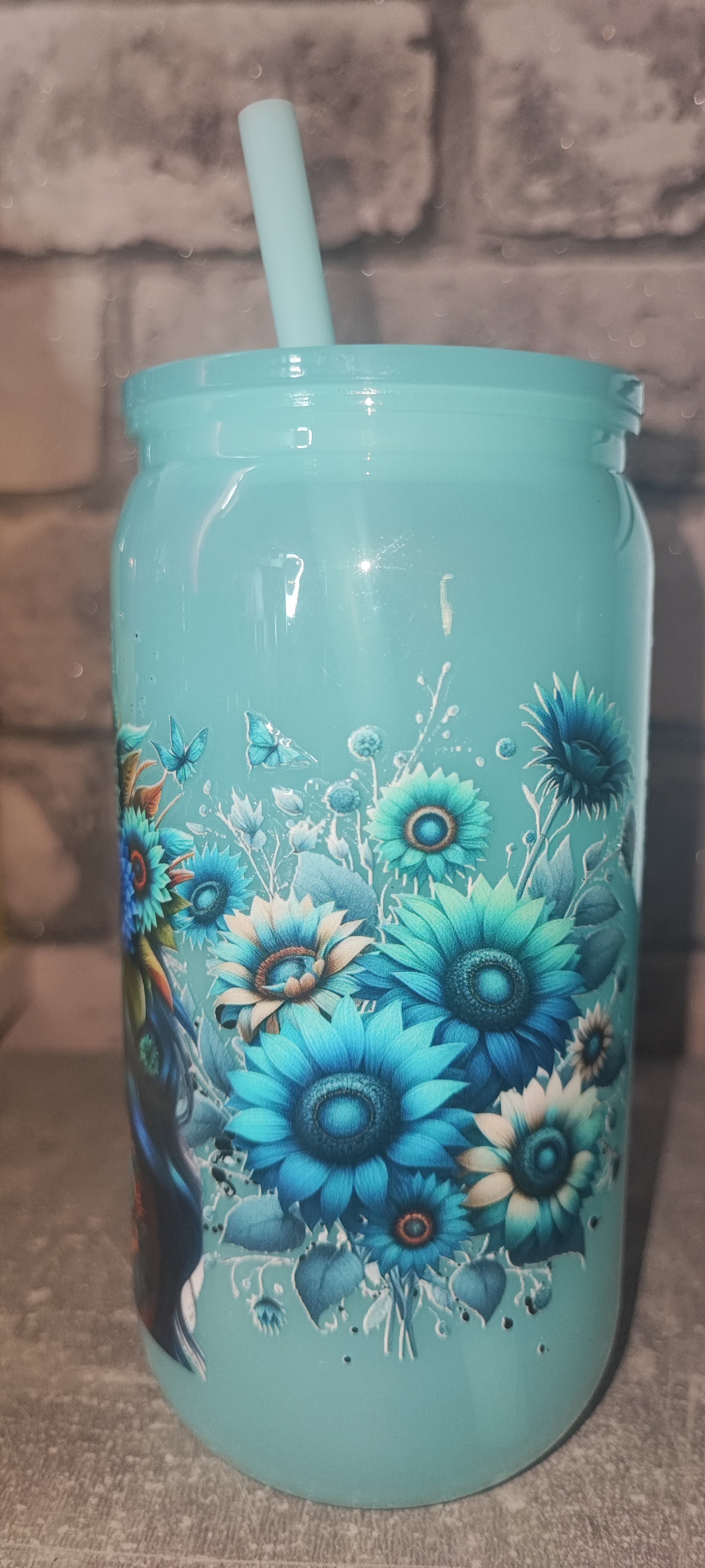 Hellblauer Becher mit Bambus Deckel +UV Dtf Aufkleber inkl Strohhalm - Kunststoff - Frau